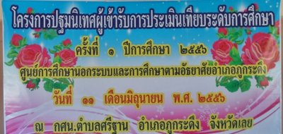ณ กศน.ตำบลศรีฐาน อำเภอภูกระดึง จังหวัดเลยโดยมี ว่าที่ ร.ต.หญิง ทิวาพร จูมศรีสิงห์ ให้เกียรติเป็นประธานในพิธีเปิด มีจุดประสงค์เพื่อ ชี้แนะแนวทางในการจัดทำแฟ้มประมวลประสบการณ์ โครงสร้างหลักสูตรเทียบระดับ มีผู้เข้ารับการประเมินเทียบระดับการศึกษา จำนวน ๒๖ คน