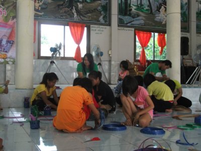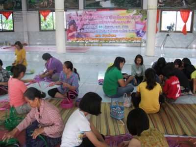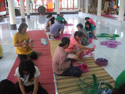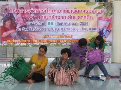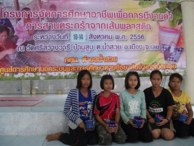 กศน.ตำบลน้ำสวย จัดโครงการจัดการศึกษาอาชีพพื่อการมีงานทำ การสานตระกร้าจากเส้นพลาสติก ในวันที่ ๑๐-๑๔ สิงหาม พ.ศ. ๒๕๕๖ ที่ วัดศรีสว่างวารี บ้านสูบ หมู่ ๙ ต.น้ำสวย อ.เมือง จ.เลย