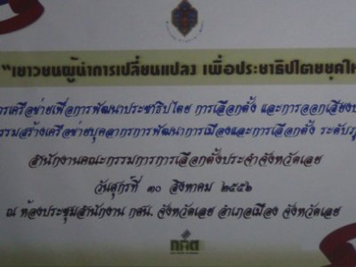 เมื่อวันที่ ๓๐ สิงหาคม ๒๕๕๖ สำนักงานคณะกรรมการการเลือกตั้ง (กกต.) ประจำจังหวัดเลย นำโดย พ.ต.อ.สุรฤทธิ์ มิ่งแก้ว รองผู้บังคับการตำรวจภูธรจังหวัดเลย, นายไชยวุฒิ มนตรีรักษ์ อาจารย์ประจำคณะวิทยาศาสตร์ ม.ราชภัฏเลย, พ.ต.อ.สาย แคนดา ข้าราชการบำนาญ ได้มาอบรมให้ความรู้เรื่อง "เยาวชนผู้นำการเปลี่ยนแปลง เพื่อประชาธิปไตยยุคใหม่" ในโครงการเครือข่ายเพื่อการพัฒนาประชาธิปไตย การเลือกตั้ง และการออกเสียงประชามติ กิจกรรมสร้างเครือข่ายบุคลากรการพัฒนาการเมืองและการเลือกตั้ง ระดับภูมิภาค ณ ห้องประชุมสำนักงาน กศน.จังหวัดเลย อำเภอเมืองเลย จังหวัดเลย ซึ่งมีนักเรียน นักศึกษา ภายในจังหวัดเลย ให้ความสนใจเข้ารับฟังการอบรมเป็นจำนวนมาก