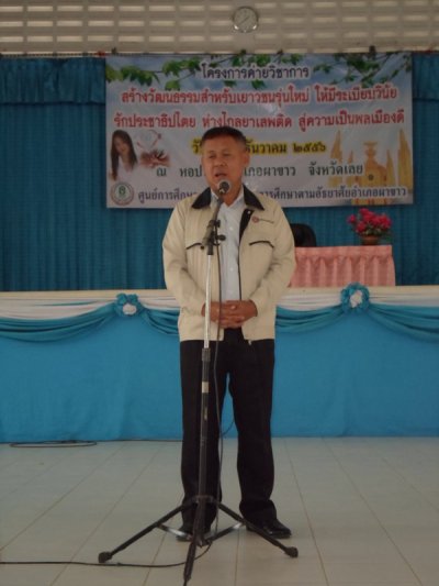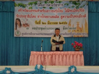 กศน.อำเภอผาขาว นำโดยท่าน สังวาล สุวรรณโสภา ผู้อำนวยการศูนย์การศึกษานอกระบบและการศึกษาตามอัธยาศัยอำเภอผาขาว พร้อมบุคลากร จัดกิจกรรมโครงการค่ายวิชาการ “สร้างวัฒนธรรมสำหรับเยาวชนรุ่นใหม่ ให้มีระเบียบวินัย รักประชาธิปไตย ห่างไกลยาเสพติด สู่ความเป็นพลเมืองดี ” ขึ้นในวัน ศุกร์ ที่ ๒๐ เดือนธันวาคม พ.ศ.๒๕๕๖ ณ ห้องประชุม อำเภอผาขาว ซึ่งได้รับเกียรติจากท่าน ปัญญา วงศ์ศรีแก้ว นายอำเภอผาขาวมาเป็นประธานในพิธีเปิดโครงการค่าย และได้รับเกียรติจากหัวหน้าส่วนราชการทุกองค์กร ทุกหน่วยงานมาเป็นเกียตริในกิจกรรมครั้งนี้ด้วย และกิจกรรมยังมีพิธีมอบ วุฒิบัตร ให้กับผู้จบหลักสูตรการศึกษาในกลุ่มเทียบระดับการศึกษาประจำภาคเรียนที่ ๑/๒๕๕๖ และตรวจสุขภาพให้กับผู้เข้าร่วมในโครงการค่ายพร้อมในกิจกรรมครั้งนี้ด้วย
