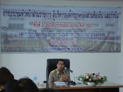 เมื่อวันที่ ๔ มีนาคม ๒๕๕๗ นายสุพัฒน์ สุวรรณสิงห์ ผอ.กศน.อำเภอเมืองเลย ร่วมการประชุมหัวหน้าส่วนราชการ ผู้บริหารองค์กรปกครองส่วนท้องถิ่น และกำนัน ครั้งที่ ๓/๒๕๕๗ ประจำเดือน มีนาคม พ.ศ.๒๕๕๗ ณ ห้องประชุมใหญ่เทศบาลตำบลนาอาน โดยมีนายโสภณ สุวรรณรัตน์ นายอำเภอเมืองเลย เป็นประธานการประชุม ซึ่ง กศน.อำเภอเมืองเลย ได้ประชาสัมพันธ์โครงการจัดตั้งห้องสมุดประชาชน "เฉลิมราชกุมารี" จังหวัดเลย ให้แก่หัวหน้าส่วนราชการได้ทราบเกี่ยวกับโครงการนี้ และเพื่อประชาสัมพันธ์โครงการให้แก่หน่วยงาน เครือข่ายทราบ