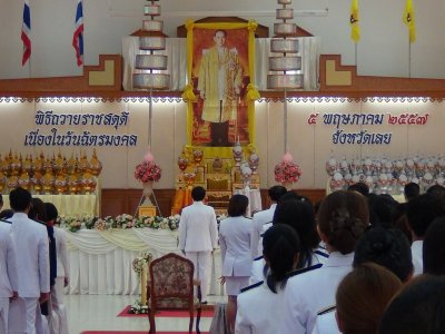 เมื่อวันที่ ๕ พฤษภาคม ๒๕๕๗ ที่ หอประชุมวิทยาลัยอาชีวเลย นายวิโรจน์ จิวะรังสรรค์ ผู้ว่าราชการจังหวัดเลยเป็นประธาน นำข้าราชการพลเรือน ทหาร ตำรวจ ทุกหมู่เหล่า เข้าร่วมพิธีถวายราชสดุดีเนื่องในวันฉัตรมงคล ในวันที่ ๕ พฤษภาคม ๒๕๕๗ เพื่อเป็นการแสดงออกถึงความจงรักภักดี และเทิดทูนองค์พระมหากษัตริย์ของพสกนิกรชาวจังหวัดเลย โดยนายบุญโชค พลดาหาญ ผู้อำนวยการ สำนักงาน กศน.จังหวัดเลย พร้อมนายสุพัฒน์ สุวรรณสิงห์ ผอ.กศน.อำเภอเมืองเลย และคณะบุคลากร ได้เข้าร่วมพิธีดังกล่าวโดยพร้อมเพรียงกัน วันฉัตรมงคล เป็นวันที่ระลึกในการครบรอบปีที่พระบาทสมเด็จพระเจ้าอยู่หัวภูมิพลอดุลยเดช ทรงรับพระบรมราชาภิเษก เป็นพระมหากษัตริย์แห่งประเทศไทยโดยสมบูรณ์ คือ พระองค์ได้ขึ้นครองราชสมบัติสืบต่อจากสมเด็จพระบรมเชษฐาธิราช พระบาทสมเด็จพระเจ้าอยู่หัวอานันทมหิดล เมื่อวันที่ ๙ มิถุนายน พ.ศ.๒๔๘๙ แล้วเสด็จพระราชดำเนินไปทรงศึกษาอยู่ ณ ทวีปยุโรป จนกระทั่งทรงบรรลุนิติภาวะแล้วจึงได้เสด็จนิวัตประเทศไทย และรัฐบาลไทยได้น้อมเกล้าฯ จัดพระราชพิธีบรมราชาภิเษกถวาย เมื่อวันที่ ๕ พฤษภาคม พ.ศ.๒๔๙๓ เหล่าพสกนิกรชาวไทยได้ถือเอาวันที่ ๕ พฤษภาคมของทุกปี เป็นวันฉัตรมงคลรำลึก
