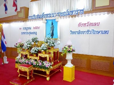 เมื่อวันที่ ๑๑ กรกฏาคม ๒๕๕๗ นายยิ่งยศ ธนะจันทร์ รองผู้ว่าราชการจังหวัดเลย เป็นประธาน นำหัวหน้าส่วนราชการ หัวหน้าหน่วยงานรัฐวิสาหกิจ ข้าราชการ ทหาร ตำรวจ ร่วมประกอบพิธีวางพวงมาลาถวายเครื่องราชสักการะเนื่องในวันสมเด็จพระนารายณ์มหาราช ประจำปี ๒๕๕๗ เพื่อน้อมรำลึกถึงพระมหากรุณาธิคุณ โดยนายบุญโชค พลดาหาญ ผู้อำนวยการสำนักงาน กศน.จังหวัดเลย พร้อมด้วยนายสุพัฒน์ สุวรรณสิงห์ ผอ.กศน.อำเภอเมืองเลย และคณะบุคลากร ครู กศน. ได้ร่วมพิธีวางพวงมาลาและถวายสักการะสมเด็จพระนารายณ์มหาราช ณ หอประชุมยอดภู วิทยาลัยอาชีวศึกษาเลย ซึ่งการจัดพิธีในวันนี้จัดเพื่อเป็นการเทิดพระเกียรติและรำลึกถึงพระมหากรุณาธิคุณของสมเด็จพระนารายณ์มหาราชที่ทรงต่อแผ่นดินไทย ทั้งนี้ สมเด็จพระนารายณ์มหาราช ทรงเป็นพระมหากษัตริย์องค์ที่ 27 ในสมัยกรุงศรีอยุธยาตอนปลาย และพระองค์ทรงเป็นพระมหากษัตริย์ผู้ยิ่งใหญ่พระองค์หนึ่งในประวัติศาสตร์ไทย ทรงมีพระราชกรณียกิจที่สำคัญตลอดรัชกาลของพระองค์ ทั้งด้านการทหาร วรรณคดี และการทูต กิจกรรมวันนี้ประกอบไปด้วย พิธีวางพวงมาลาถวายราชสักการะพระบรมสาทิสลักษณ์ฯ และกล่าวคำสดุดีเทิดพระเกียรติสมเด็จพระนารายณ์มหาราช.