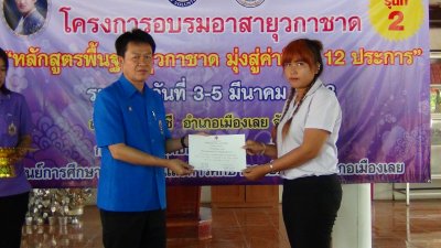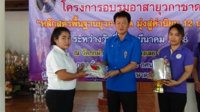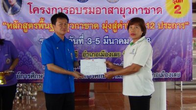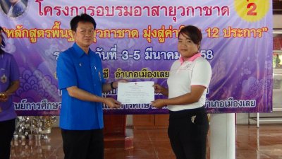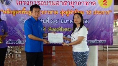 นายสุพัฒน์ สุวรรณสิงห์ ผอ.กศน.อำเภอเมืองเลย มอบวุฒิบัตรฯ ให้กับผู้ผ่านการอบรมอาสายุวกาชาด หลักสูตรพื้นฐานยุวกาชาด มุ่งสู่ค่านิยม ๑๒ ประการ รุ่นที่ ๒