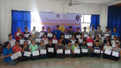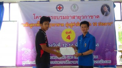 นายสุพัฒน์ สุวรรณสิงห์ ผอ.กศน.อำเภอเมืองเลย มอบวุฒิบัตร ให้กับผู้ผ่านการอบรมอาสายุวกาชาด มุ่งสู่ค่านิยม ๑๒ ประการ รุ่นที่ ๔ ณ วัดป่าโพธิ์ธาราม ต.นาดินดำ อ.เมืองเลย จ.เลย