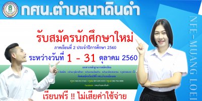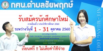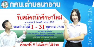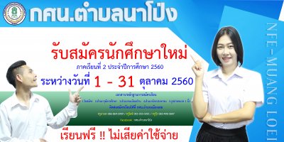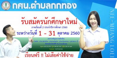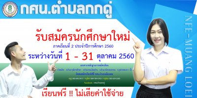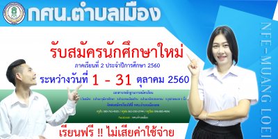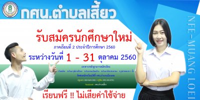 กศน.อำเภอเมืองเลย เปิดรับสมัครนักศึกษาใหม่ ภาคเรียนที่ ๒/๒๕๖๐ ระหว่างวันที่ ๑ - ๓๑ ตุลาคม ๒๕๖๐ เรียนฟรีไม่เสียค่าใช่จ่ายใดๆทั้งสิ้น