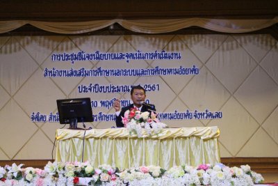 เมื่อวันที่ ๑๐ พฤศจิกายน ๒๕๖๐ นายชัยวัฒน์ ชื่นโกสุม ผู้ว่าราชการจังหวัดเลย เป็นประธาน การประชุมชี้แจงนโยบายจุดเน้นการดำเนินงาน สำนักงานส่งเสริมการศึกษานอกระบบและการศึกษาตามอัธยาศัย ประจำปีงบประมาณ ๒๕๖๑ โดยมีนายปัญญา ศาสตรา ผอ.กศน.จ.เลย พร้อมคณะผู้บริหาร และบุคลากร กศน. ให้การต้อนรับ ซึ่งนายสุพัฒน์ สุวรรณสิงห์ ผอ.กศน.อำเภอเมืองเลย ได้นำคณะ บุคลากร กศน.อ.เมืองเลย ทั้งหมด เข้าร่วมรับ-มอบนโยบายจุดเน้นการดำเนินงาน ณ ห้องประชุมใบคำ โรงแรมใบบุญแกรนด์ อ.เมืองเลย จ.เลย
