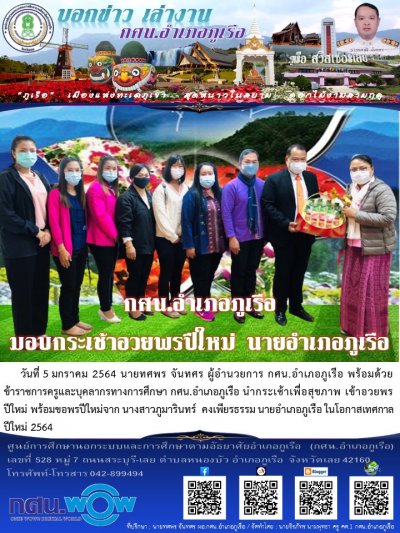 วันที่ 5 มกราคม 2564 นายทศพร จันทศร ผู้อำนวยการ กศน.อำเภอภูเรือ พร้อมด้วยข้าราชการครูและบุคลากรทางการศึกษา กศน.อำเภอภูเรือ นำกระเช้าเพื่อสุขภาพ เข้าอวยพรปีใหม่ พร้อมขอพรปีใหม่จาก นางสาวภูมารินทร์ คงเพียรธรรม นายอำเภอภูเรือ ในโอกาสเทศกาลปีใหม่ 2564