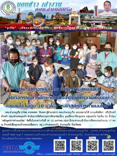 กศน.อำเภอภูเรือ นำโดย นายทศพร จันทศร ผู้อำนวยการ กศน.อำเภอภูเรือ มอบหมายให้ นางแพ็ทติยา ศรีบุรินทร์หัวหน้า กศน.ตำบลหนองบัว ดำเนินการจัดกิจกรรมการศึกษาต่อเนื่อง ศูนย์ฝึกอาชีพชุมชน กลุ่มสนใจ ไม่เกิน 30 ชั่วโมง “หลักสูตรการทำขนมไทย” จัดขึ้นในระหว่างวันที่ 18 –