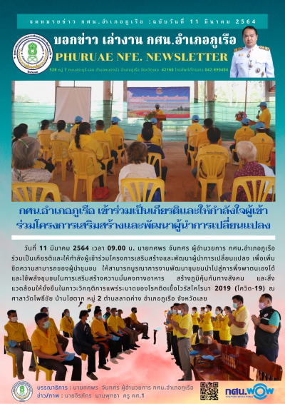 วันที่ 11 มีนาคม 2564 เวลา 09.00 น. นายทศพร จันทศร ผู้อำนวยการ กศน.อำเภอภูเรือ ร่วมเป็นเกียรติและให้กำลังผู้เข้าร่วมโครงการเสริมสร้างและพัฒนาผู้นำการเปลี่ยนแปลง เพื่อเพิ่มขีดความสามารถของผู้นำชุมชน ให้สามารถบูรณาการงานพัฒนาชุมชนนำไปสู่การพึ่งพาตนเองได้ และใช้พลังชุมชนในการเสริมสร้างความมั่นคงทางอาหาร สร้างภูมิคุ้มกันทางสังคม และสิ่งแวดล้อมให้ยั่งยืนในภาวะวิกฤติการแพร่ระบาดของโรคติดเชื้อไวรัสโคโรนา 2019 (โควิด-19) ณ ศาลาวัดโพธิ์ชัย บ้านไฮตาก หมู่ 2 ตำบลลาดค่าง อำเภอภูเรือ จังหวัดเลย