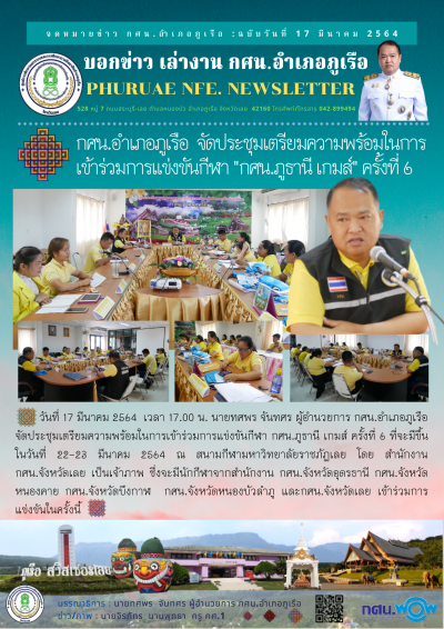วันที่ 17 มีนาคม 2564 เวลา 17.00 น. นายทศพร จันทศร ผู้อำนวยการ กศน.อำเภอภูเรือ จัดประชุมเตรียมความพร้อมในการเข้าร่วมการแข่งขันกีฬา กศน.ภูธานี เกมส์ ครั้งที่ 6 ที่จะมีขึ้นในวันที่ 22-23 มีนาคม 2564 ณ สนามกีฬามหาวิทยาลัยราชภัฎเลย โดย สำนักงาน กศน.จังหวัดเลย เป็นเจ้าภาพ ซึ่งจะมีนักกีฬาจากสำนักงาน กศน.จังหวัดอุดรธานี กศน.จังหวัดหนองคาย กศน.จังหวัดบึงกาฬ กศน.จังหวัดหนองบัวลำภู และกศน.จังหวัดเลย เข้าร่วมการแข่งขันในครั้งนี้
