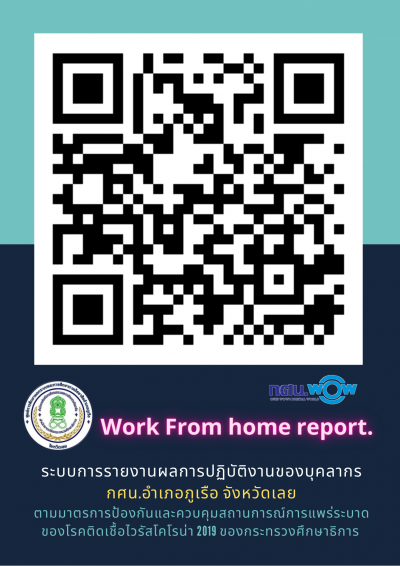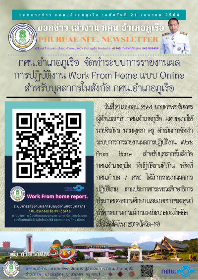 วันที่ 21 เมษายน 2564 นายทศพร จันทศร ผู้อำนวยการ กศน.อำเภอภูเรือ มอบหมายให้นายจิรภัทร นามพุทธา ครู ดำเนินการจัดทำระบบการการรายงานผลการปฏิบัติงาน Work From Home สำหรับบุคลากรในสังกัด กศน.อำเภอภูเรือ ที่ปฏิบัติงานที่บ้าน หรือที่ี กศน.ตำบล / ศรช. ได้มีการรายงานผลการปฏิบัติงาน ตามประกาศกระทรวงศึกษาธิการ ประกาศของสถานศึกษา และมาตรการของศูนย์บริหารสถานการณ์การแพร่ระบาดของโรคติดเชื้อไวรัสโคโรนา 2019 (โควิด-19)