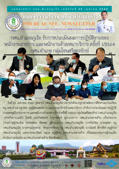 กศน.อำเภอภูเรือ รับการประเมินผลการปฏิบัติงานของ พนักงานราชการ และพนักงานจ้างเหมาบริการ ครั้งที่ 1/2564 กศน.อำเภอ กลุ่มโซนศรีสองรักษ์