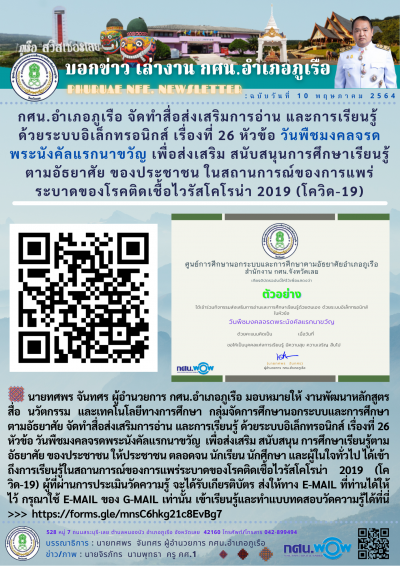 กศน.อำเภอภูเรือ จัดทำสื่อส่งเสริมการอ่าน และการเรียนรู้ ด้วยระบบอิเล็กทรอนิกส์ เรื่องที่ 26 หัวข้อ วันพืชมงคลจรดพระนังคัลแรกนาขวัญ เพื่อส่งเสริม สนับสนุนการศึกษาเรียนรู้ ตามอัธยาศัย ของประชาชน ในสถานการณ์ของการแพร่ระบาดของโรคติดเชื้อไวรัสโคโรน่า 2019