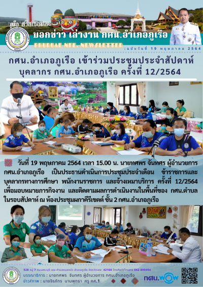 วันที่ 19 พฤษภาคม 2564 เวลา 15.00 น. นายทศพร จันทศร ผู้อำนวยการ กศน.อำเภอภูเรือ เป็นประธานดำเนินการประชุมประจำเดือน ข้าราชการและบุคลากรทางการศึกษา พนักงานราชการ และจ้างเหมาบริการ ครั้งที่ 12/2564 เพื่อมอบหมายภารกิจงาน และติดตามผลการดำเนินงานในพื้นที่ของ กศน.ตำบลในรอบสัปดาห์ ณ ห้องประชุมผกาคีรีเขตต์ ชั้น 2 กศน.อำเภอภูเรือ