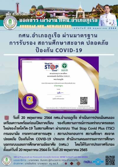 วันที่ 20 พฤษภาคม 2564 กศน.อำเภอภูเรือ ดำเนินการประเมินตนเองเตรียมความพร้อมก่อนเปิดภาคเรียน รองรับสถานการณ์การแพร่ระบาดระลอกใหม่ของโรคโควิด-19 ในสถานศึกษา ผ่านระบบ Thai Stop Covid Plus (TSC) กรมอนามัย กระทรวงสาธารณสุข : สถานประกอบการ สถานศึกษา สะอาดปลอดภัย ป้องกันโรค COVID-19 ประเภท สำนักงานคณะกรรมการการศึกษานอกระบบและการศึกษาตามอัธยาศัย (กศน.) โดยได้รับการประกาศรับรอง ตั้งแต่วันที่ 20 พฤษภาคม 2564 ถึง วันที่ 20 พฤษภาคม 2565
