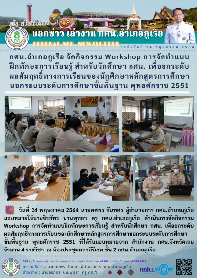 วันที่ 24 พฤษภาคม 2564 นายทศพร จันทศร ผู้อำนวยการ กศน.อำเภอภูเรือ มอบหมายให้นายจิรภัทร นามพุทธา ครู กศน.อำเภอภูเรือ ดำเนินการจัดกิจกรรม Workshop การจัดทำแบบฝึกทักษะการเรียนรู้ สำหรับนักศึกษา กศน. เพื่อยกระดับผลสัมฤทธิ์ทางการเรียนของนักศึกษาหลักสูตรการศึกษานอกระบบระดับการศึกษาขั้นพื้นฐาน พุทธศักราช 2551 ที่ได้รับมอบหมายจาก สำนักงาน กศน.จังหวัดเลย จำนวน 4 รายวิชา ณ ห้องประชุมผกาคีรีเขต ชั้น 2 กศน.อำเภอภูเรือ