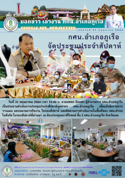 วันที่ 31 พฤษภาคม 2564 เวลา 15.00 น. นายทศพร จันทศร ผู้อำนวยการ กศน.อำเภอภูเรือ เป็นประธานดำเนินการประชุมประจำสัปดาห์บุคลากร กศน.อำเภอภูเรือ เพื่อแจ้งข้อราชการ วางแผน มอบหมายภารกิจงาน ในรอบสัปดาห์ และติดตามการดำเนินงานในพื้นที่ของ กศน.ตำบล ในสังกัด ในรอบสัปดาห์ที่ผ่านมา ณ ห้องประชุมผกาคีรีเขตต์ ชั้น 2 กศน.อำเภอภูเรือ จังหวัดเลย