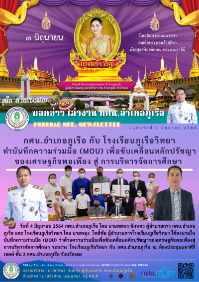วันที่ 4 มิถุนายน 2564 กศน.อำเภอภูเรือ โดย นายทศพร จันทศร ผู้อำนวยการ กศน.อำเภอภูเรือ และ โรงเรียนภูเรือวิทยา โดย นายพยุง โพธิ์ชัย ผู้อำนวยการโรงเรียนภูเรือวิทยา ได้ลงนามในบันทึกความร่วมมือ (MOU) ว่าด้วยความร่วมมือเพื่อขับเคลื่อนหลักปรัชญาของเศรษฐกิจพอเพียงสู่การบริหารจัดการศึกษา ระหว่าง โรงเรียนภูเรือวิทยา กับ กศน.อำเภอภูเรือ ณ ห้องประชุมผกาคีรีเขตต์ ชั้น 2 กศน.อำเภอภูเรือ จังหวัดเลย