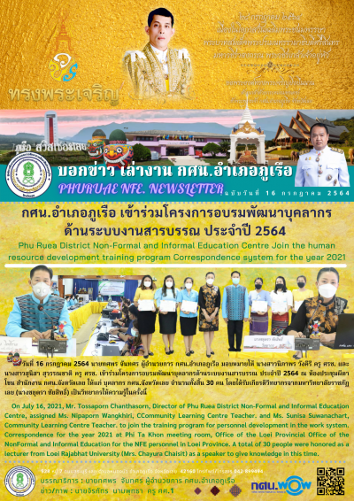 วันที่ 16 กรกฎาคม 2564 นายทศพร จันทศร ผู้อำนวยการ กศน.อำเภอภูเรือ มอบหมายให้ นางสาวนิภาพร วังคีรี ครู ศรช. และนางสาวสุนิสา สุวรรณชาติ ครู ศรช. เข้าร่วมโครงการอบรมพัฒนาบุคลากรด้านระบบงานสารบรรณ ประจำปี 2564 ณ ห้องประชุมผีตาโขน สำนักงาน กศน.จังหวัดเลย ให้แก่ บุคลากร กศน.จังหวัดเลย จำนวนทั้งสิ้น 30 คน โดยได้รับเกียรติวิทยากรจากมหาวิทยาลัยราชภัฏเลย (นางชยุตรา ชัยสิทธิ์) เป็นวิทยากรให้ความรู้ในครั้งนี้ On July 16, 2021, Mr. Tossaporn Chanthasorn, Director of Phu Ruea District Non-Formal and Informal Education Centre, assigned Ms. Nipaporn Wangkhiri, CCommunity Learning Centre Teacher. and Ms. Sunisa Suwanachart, Community Learning Centre Teacher. to join the training program for personnel development in the work system. Correspondence for the year 2021 at Phi Ta Khon meeting room, Office of the Loei Provincial Office of the NonFormal and Informal Education for the NFE personnel in Loei Province. A total of 30 people were honored as a lecturer from Loei Rajabhat University (Mrs. Chayura Chaisit) as a speaker to give knowledge in this time.