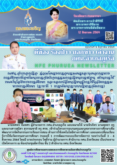 นายทศพร จันทศร ผู้อำนวยการ กศน.อำเภอภูเรือ มอบหมายให้ นายจิรภัทร นามพุทธา ครู และนางสาวสุนิสา สุวรรณชาติ ครู ศรช. เข้าร่วมโครงการอบรมครูและบุคลากรทางการศึกษาเพื่อพัฒนาการจัดกิจกรรมการเรียนการสอน ด้านการใช้เทคโนโลยีทางการศึกษา และแลกเปลี่ยนเรียนรู้การใช้นวัตกรรมทางการศึกษา (ระยะที่ 1 การพัฒนาระบบบริหารจัดการ) ระหว่างวันที่ 3 - 6 สิงหาคม 2564 โดยมี นายประกอบ โพธิ์ราม ผู้อำนวยการ สำนักงาน กศน.จังหวัดเลย เป็นประธานเปิดโครงการ ณ ห้องประชุมผีตาโขน ชั้น 2 สำนักงาน กศน.จังหวัดเลย