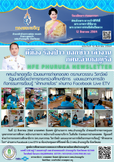 วันที่ 12 สิงหาคม 2564 นายทศพร จันทศร ผู้อำนวยการ กศน.อำเภอภูเรือ นำคณะข้าราชการครูและบุคลากรทางการศึกษา พนักงานราชการ พนักงานจ้างเหมาบริการ ในสังกัด ร่วมชมการถ่ายทอดสด