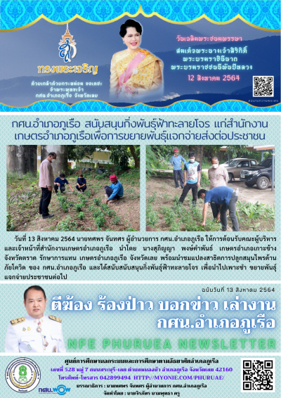 วันที่ 13 สิงหาคม 2564 นายทศพร จันทศร ผู้อำนวยการ กศน.อำเภอภูเรือ ให้การต้อนรับคณะผู้บริหารและเจ้าหน้าที่สำนักงานเกษตรอำเภอภูเรือ นำโดย นางสุภิญญา พงษ์คำพันธ์ เกษตรอำเภอเกาะช้าง จังหวัดตราด รักษาการแทน เกษตรอำเภอภูเรือ จังหวัดเลย พร้อมนำชมแปลงสาธิตการปลูกสมุนไพรต้านภัยโควิด ของ กศน.อำเภอภูเรือ และได้สนับสนับสนุนกิ่งพันธุ์ฟ้าทะลายโจร เพื่อนำไปเพาะชำ ขยายพันธุ์แจกจ่ายประชาชนต่อไป