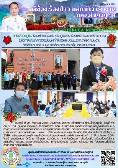นศุกร์ ที่ 24 กันยายน 2564 นายทศพร จันทศร ผู้อำนวยการ กศน.อำเภอภูเรือ ร่วมให้การต้อนรับ ดร. ภูมิพัทธ เรืองแหล่ รองเลขาธิการ กศน. ในโอกาสมานิเทศตรวจเยี่ยมให้กำลังใจและมอบแนว ทางการดำเนินงานการศึกษานอกระบบและการศึกษาตามอัธยาศัย กศน.จังหวัดเลย พร้อมทั้งติดตามผลการดำเนินงานการสำรวจนักศึกษา กศน. ที่มีความประสงค์ขอรับบริการฉีดวัคซีนป้องกันโรคติดเชื้อโคโรนา 2019 พร้อมมอบนโยบายในการดำเนินการจัดสอบวัดผลสัมฤทธิ์ปลายภาคเรียนที่ 1 ปีการศึกษา 2564 โดยมี นายประกอบ โพธิ์ราม ผู้อำนวยการสำนักงาน กศน.จังหวัดเลย กล่าวต้อนรับ พร้อมด้วยผู้บริหารสถานศึกษาในสังกัด และบุคลากรสำนักงาน กศน.จังหวัดเลย ร่วมให้การต้อนรับ ณ ห้องประชุมผีตาโขน สำนักงาน กศน.จังหวัดเลย