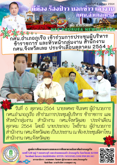 กศน.อำเภอภูเรือ เข้าร่วมการประชุมผู้บริหาร ข้าราชการ และหัวหน้ากลุ่มงาน สำนักงาน กศน.จังหวัดเลย ประจำเดือนตุลาคม 2564