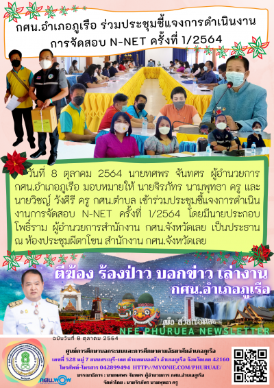 วันที่ 8 ตุลาคม 2564 นายทศพร จันทศร ผู้อำนวยการ กศน.อำเภอภูเรือ มอบหมายให้ นายจิรภัทร นามพุทธา ครู และนายวิชญ์ วังคีรี ครู กศน.ตำบล เข้าร่วมประชุมชี้แจงการดำเนินงานการจัดสอบ N-NET ครั้งที่ 1/2564 โดยมีนายประกอบ โพธิ์ราม ผู้อำนวยการสำนักงาน กศน.จังหวัดเลย เป็นประธาน ณ ห้องประชุมผีตาโขน สำนักงาน กศน.จังหวัดเลย