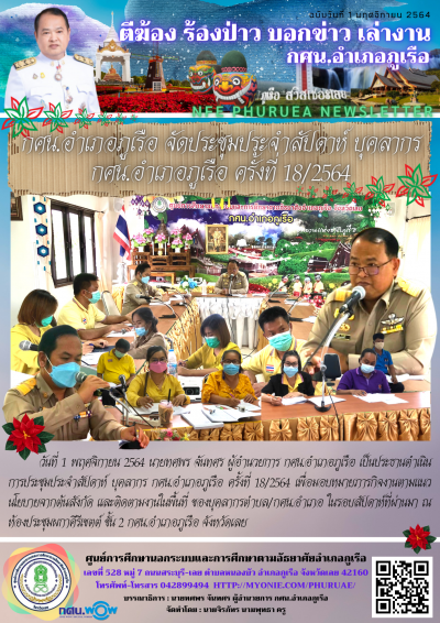 วันที่ 1 พฤศจิกายน 2564 นายทศพร จันทศร ผู้อำนวยการ กศน.อำเภอภูเรือ เป็นประธานดำเนินการประชุมประจำสัปดาห์ บุคลากร กศน.อำเภอภูเรือ ครั้งที่ 18/2564 เพื่อมอบหมายภารกิจงานตามแนวนโยบายจากต้นสังกัด และติดตามงานในพื้นที่ ของบุคลากรตำบล/กศน.อำเภอ ในรอบสัปดาห์ที่ผ่านมา ณ ห้องประชุมผกาคีรีเขตต์ ชั้น 2 กศน.อำเภอภูเรือ จังหวัดเลย