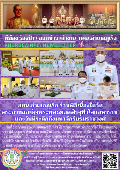วันที่ 6 เมษายน 2565 นายทศพร จันทศร ผู้อำนวยการ กศน.อำเภอภูเรือ ได้รับมอบหมายจาก ผู้อำนวยการ สำนักงาน กศน.จังหวัดเลย นำคณะบุคลากร สำนักงาน กศน.จังหวัดเลย เข้าร่วมพิธีเนื่องในวันพระบาทสมเด็จพระพุทธยอดฟ้าจุฬาโลกมหาราช และวันที่ระลึกถึงมหาจักรีบรมราชวงศ์ โดยมีนายชัยธวัช เนียมศิริ ผู้ว่าราชการจังหวัดเลย เป็นประธานในพิธี ณ หอประชุมยอดภู วิทยาลัยอาชีวศึกษาเลย อำเภอเมือง จังหวัดเลย