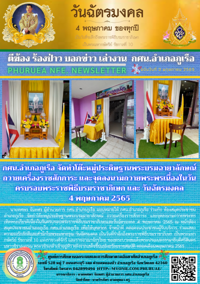 กศน.อำเภอภูเรือ จัดทำโต๊ะหมู่ประดิษฐานพระบรมฉายาลักษณ์ ถวายเครื่องราชสักการะ และจุดลงนามถวายพระพรเนื่องในวันครบรอบพระราชพิธีบรมราชาภิเษก และ วันฉัตรมงคล 4 พฤษภาคม 2565