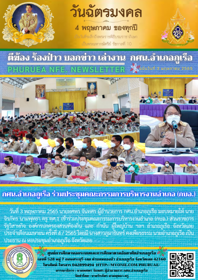 วันที่ 3 พฤษภาคม 2565 นายทศพร จันทศร ผู้อำนวยการ กศน.อำเภอภูเรือ มอบหมายให้ นายจิรภัทร นามพุทธา ครู คศ.1 เข้าร่วมประชุมคณะกรรมการบริหารงานอำเภอ (กบอ.) ส่วนราชการ รัฐวิสาหกิจ องค์กรปกครองส่วนท้องถิ่น และ กำนัน ผู้ใหญ่บ้าน ฯลฯ อำเภอภูเรือ จังหวัดเลย ประจำเดือนเมษายน ครั้งที่ 4 / 2565 โดยมี นางสาวภูมารินทร์ คงเพียรธรรม นายอำเภอภูเรือ เป็น