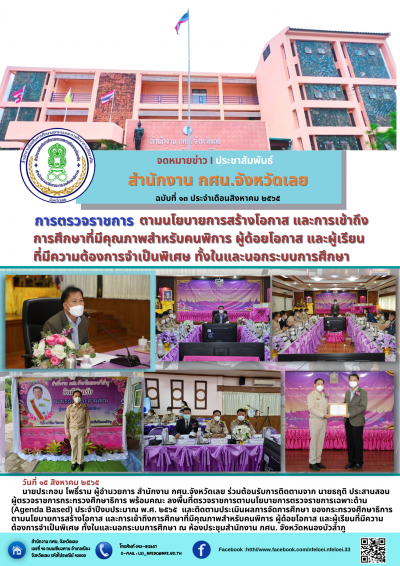 วันที่ ๑๕ สิงหาคม ๒๕๖๕ นายประกอบ โพธิ์ราม ผู้อำนวยการ สำนักงาน กศน.จังหวัดเลย ร่วมต้อนรับการติดตามจาก นายธฤติ ประสานสอน ผู้ตรวจราชการกระทรวงศึกษาธิการ พร้อมคณะ ลงพื้นที่ตรวจราชการตามนโยบายการตรวจราชการเฉพาะด้าน (Agenda Based) ประจำปีงบประมาณ พ.ศ. ๒๕๖๕ และติดตามประเมินผลการจัดการศึกษา ของกระทรวงศึกษาธิการ ตามนโยบายการสร้างโอกาส และการเข้าถึงการศึกษาที่มีคุณภาพสำหรับคนพิการ ผู้ด้อยโอกาส และผู้เรียนที่มีความต้องการจำเป็นพิเศษ ทั้งในและนอกระบบการศึกษา ณ ห้องประชุมสำนักงาน กศน. จังหวัดหนองบัวลำภู