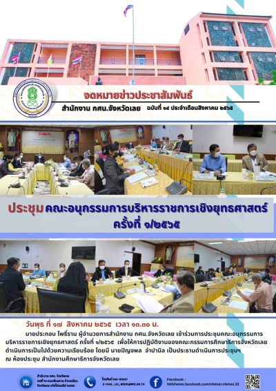 วันพุธ ที่ ๑๗ สิงหาคม ๒๕๖๕ เวลา ๑๓.๓๐ น. นายประกอบ โพธิ์ราม ผู้อำนวยการสำนักงาน กศน.จังหวัดเลย เข้าร่วมการประชุมคณะอนุกรรมการบริหารราชการเชิงยุทธศาสตร์ ครั้งที่ ๑/๒๕๖๕ เพื่อให้การปฏิบัติงานของคณะกรรมการศึกษาธิการจังหวัดเลย ดำเนินการเป็นไปด้วยความเรียบร้อย โดยมี นายปัญจพล จำปานิล เป็นประธานดำเนินการประชุมฯ ณ ห้องประชุม สำนักงานศึกษาธิการจังหวัดเลย