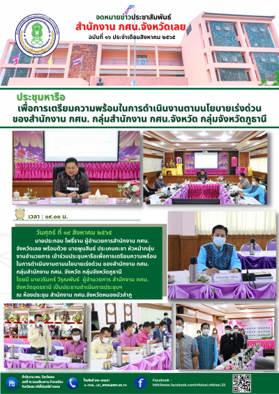วันศุกร์ ที่ ๑๙ สิงหาคม ๒๕๖๕ นายประกอบ โพธิ์ราม ผู้อำนวยการสำนักงาน กศน. จังหวัดเลย พร้อมด้วย นายพูนสินธ์ ประเคนคะชา หัวหน้ากลุ่มงานอำนวยการ เข้าร่วมประชุมหารือเพื่อการเตรียมความพร้อม ในการดำเนินงานตามนโยบายเร่งด่วน ของสำนักงาน กศน. กลุ่มสำนักงาน กศน. จังหวัด กลุ่มจังหวัดภูธานี โดยมี นายวรินทร์ วิรุณพันธ์ ผู้อำนวยการ สำนักงาน กศน. จังหวัดอุดรธานี เป็นประธานดำเนินการประชุมฯ ณ ห้องประชุม สำนักงาน กศน.จังหวัดหนองบัวลำภู