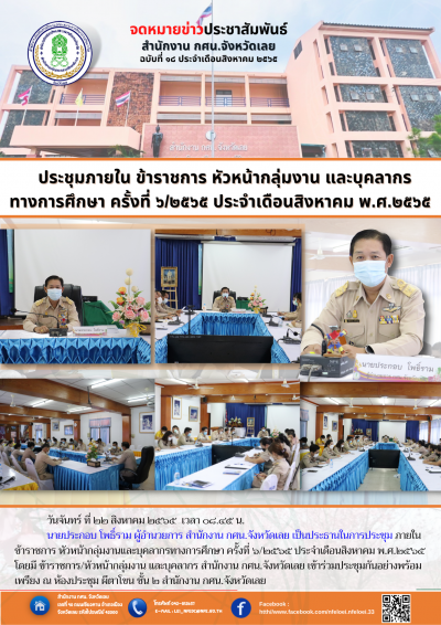 วันจันทร์ ที่ ๒๒ สิงหาคม ๒๕๖๕ เวลา ๐๘.๔๕ น. นายประกอบ โพธิ์ราม ผู้อำนวยการ สำนักงาน กศน.จังหวัดเลย เป็นประธานในการประชุม ภายในข้าราชการ หัวหน้ากลุ่มงานและบุคลากรทางการศึกษา ครั้งที่ ๖/๒๕๖๕ ประจำเดือนสิงหาคม พ.ศ.๒๕๖๕ โดยมี ข้าราชการ/หัวหน้ากลุ่มงาน และบุคลากร สำนักงาน กศน.จังหวัดเลย เข้าร่วมประชุมกันอย่างพร้อมเพรียง ณ ห้องประชุม ผีตาโขน ชั้น ๒ สำนักงาน กศน.จังหวัดเลย
