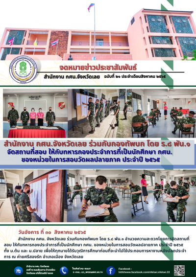 วันอังคาร ที่ ๓๐ สิงหาคม ๒๕๖๕ สำนักงาน กศน. จังหวัดเลย ร่วมกับกองทัพบก โดย ร.๘ พัน.๑ อำนวยความสะดวกโดยการจัดสถานที่สอบ ให้กับทหารกองประจำการที่เป็นนักศึกษา กศน. ของหน่วยในการสอบวัดผลปลายภาค ประจำปี ๒๕๖๕ ทั้ง ม.ต้น และ ม.ปลาย เพื่อให้ทุกนายได้รับวุฒิการศึกษาก่อนที่จะนำไปใช้ประกอบการหางานหลังปลดประจำการ ณ ค่ายศรีสองรัก อำเภอเมือง จังหวัดเลย