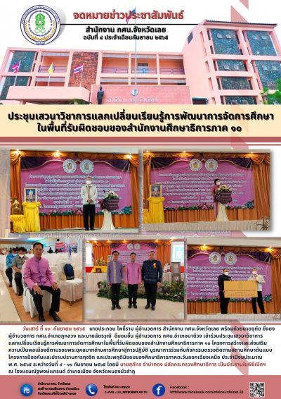 แลกเปลี่ยนเรียนรู้การพัฒนาการจัดการศึกษาในพื้นที่รับผิดชอบของสำนักงานศึกษาธิการภาค ๑๐ โครงการสร้างและส่งเสริมความเป็นพลเมืองดีตามรอยพระยุคลบาทด้านการศึกษาสู่การปฏิบัติ บูรณาการร่วมกับกิจกรรมตรวจติดตามสถานศึกษาตันแบบ โครงการป้องกันและปราบปรามการทุจริต และประพฤติมิชอบของศึกษาธิการภาคตะวันออกเฉียงเหนือ ประจำปีงบประมาณ