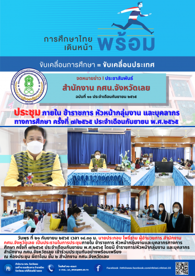 วันพุธ ที่ ๒๑ กันยายน ๒๕๖๕ เวลา ๑๔.๓๐ น. นายประกอบ โพธิ์ราม ผู้อำนวยการ สำนักงาน กศน.จังหวัดเลย เป็นประธานในการประชุมภายใน ข้าราชการ หัวหน้ากลุ่มงานและบุคลากรทางการศึกษา ครั้งที่ ๗/๒๕๖๕ ประจำเดือนกันยายน พ.ศ.๒๕๖๕ โดยมี ข้าราชการ/หัวหน้ากลุ่มงาน และบุคลากร สำนักงาน กศน.จังหวัดเลย เข้าร่วมประชุมกันอย่างพร้อมเพรียง ณ ห้องประชุม ผีตาโขน ชั้น ๒ สำนักงาน กศน.จังหวัดเลย