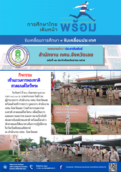 วันจันทร์ ที่ ๒๖ กันยายน ๒๕๖๕ เวลา ๐๘.๐๐ น. นายประกอบ โพธิ์ราม ผู้อำนวยการ สำนักงาน กศน.จังหวัดเลย พร้อมด้วยข้าราชการ บุคลากร สำนักงาน กศน.จังหวัดเลย ร่วมกิจกรรมเคารพธงชาติ สวดมนต์ไหว้พระ เพื่อเป็นการแสดงความเคารพ และความจงรักภักดีต่อสถาบันหลักของชาติ พร้อมทั้งกล่าวทักทายและให้แนวทางในการปฏิบัติงาน ในวันเริ่มต้นของสัปดาห์ ณ สำนักงาน กศน. จังหวัดเลย