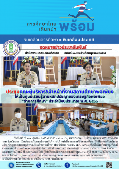 วันจันทร์ ที่ ๑๗ ตุลาคม ๒๕๖๕ เวลา ๐๙.๓๐ น. นายประกอบ โพธิ์ราม ผู้อำนวยการ สำนักงาน กศน.จังหวัดเลย เป็นประธานในการประชุมผู้บริหาร/เจ้าหน้าที่งานสถานศึกษาพอเพียง ให้เป็นศูนย์เรียนรู้ตามหลักปรัชญาของเศรษฐกิจพอเพียงด้านการศึกษา ประจำปีงบประมาณ พ.ศ. ๒๕๖๖ ทั้งนี้ได้รับความอนุเคราะห์จากนางสาวประไพศรี คงตระกูล ผู้เข้ารับการฝึกประสบการณ์ ตำแหน่งผู้อำนวยการ สำนักงาน กศน.จังหวัด และนางเยาวลักษณ์ ป้อมภกรรณ์สวัสดิ์ ผู้เข้ารับการฝึกประสบการณ์ตำแหน่ง รองผู้อำนวยการสำนักงาน กศน. จังหวัด ได้ให้ความรู้และแนวทางการดำเนินงานแก่ผู้บริหาร และเจ้าหน้าที่งานสถานศึกษาพอเพียง ณ ห้องประชุม ผีตาโขน ชั้น ๒ สำนักงาน กศน. จังหวัดเลย