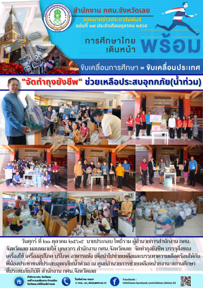 วันศุกร์ ที่ ๒๑ ตุลาคม ๒๕๖๕ นายประกอบ โพธิ์ราม ผู้อำนวยการสำนักงาน กศน. จังหวัดเลย มอบหมายให้ บุคลากร สำนักงาน กศน.จังหวัดเลย จัดทำถุงยังชีพ บรรจุสิ่งของเครื่องใช้ เครื่องอุปโภค บริโภค อาหารแห้ง เพื่อนำไปช่วยเหลือและบรรเทาความเดือดร้อนให้กับพี่น้องประชาชนที่ประสบอุทกภัย(น้ำท่วม) ณ ศูนย์อำนวยการช่วยเหลือหน่วยงาน/สถานศึกษาที่ประสบภัยภิบัติ สำนักงาน กศน.จังหวัดเลย