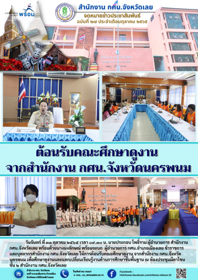 วันจันทร์ ที่ ๓๑ ตุลาคม ๒๕๖๕ เวลา ๐๙.๓๐ น. นายประกอบ โพธิ์ราม ผู้อำนวยการ สำนักงาน กศน.จังหวัดเลย พร้อมด้วยนางนงลักษณ์ พร้อมจะบก ผู้อำนวยการ กศน.อำเภอเมืองเลย ข้าราชการและบุคลากรสำนักงาน กศน.จังหวัดเลย ให้การต้อนรับคณะศึกษาดูงาน จากสำนักงาน กศน.จังหวัดนครพนม เพื่อศึกษาดูงานและแลกเปลี่ยนเรียนรู้งานด้านการศึกษาขั้นพื้นฐาน ณ ห้องประชุมผีตาโขน ชั้น ๒ สำนักงาน กศน.จังหวัดเลย