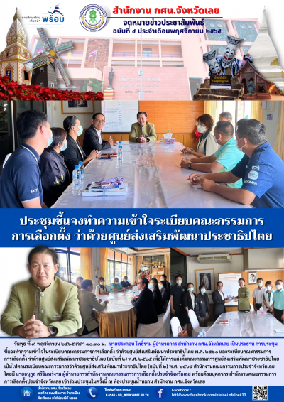 ชี้แจงทำความเข้าใจในระเบียบคณะกรรมการการเลือกตั้ง ว่าด้วยศูนย์ส่งเสริมพัฒนาประชาธิปไตย พ.ศ. ๒๕๖๐ และระเบียบคณะกรรมการ การเลือกตั้ง ว่าด้วยศูนย์ส่งเสริมพัฒนาประชาธิปไตย (ฉบับที่ ๒) พ.ศ. ๒๕๖๕ เพื่อให้การแต่งตั้งคณะกรรมการศูนย์ส่งเสริมพัฒนาประชาธิปไตย เป็นไปตามระเบียบคณะกรรมการว่าด้วยศูนย์ส่งเสริมพัฒนาประชาธิปไตย (ฉบับที่ ๒) พ.ศ. ๒๕๖๕ สำนักงานคณะกรรมการประจำจังหวัดเลย โดยมี