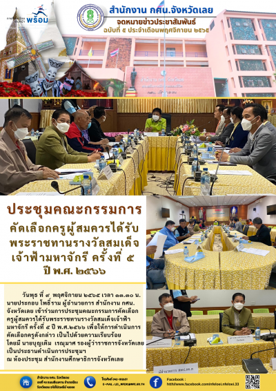 วันพุธ ที่ ๙ พฤศจิกายน ๒๕๖๕ เวลา ๑๓.๓๐ น. นายประกอบ โพธิ์ราม ผู้อำนวยการ สำนักงาน กศน. จังหวัดเลย เข้าร่วมการประชุมคณะกรรมการคัดเลือกครูผู้สมควรได้รับพระราชทานรางวัลสมเด็จเจ้าฟ้ามหาจักรี ครั้งที่ ๕ ปี พ.ศ.๒๕๖๖ เพื่อให้การดำเนินการคัดเลือกครูดังกล่าว เป็นไปด้วยความเรียบร้อย โดยมี นายบุญเติม เรณุมาศ รองผู้ว่าราชการจังหวัดเลย เป็นประธานดำเนินการประชุมฯ ณ ห้องประชุม สำนักงานศึกษาธิการจังหวัดเลย