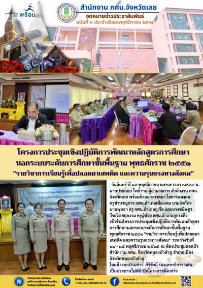 วันจันทร์ ที่ ๑๔ พฤศจิกายน ๒๕๖๕ เวลา ๐๙.๐๐ น. นายประกอบ โพธิ์ราม ผู้อำนวยการ สำนักงาน กศน. จังหวัดเลย พร้อมด้วยนางวาสนา โสธรรมมงคล ครูชำนาญการ กศน.อำเภอเมืองเลย นายจิรภัทร นามพุทธา ครู กศน.อำเภอภูเรือ และนางขนิษฐา วีระจิตสกุลงาม ครูผู้ช่วย กศน.อำเภอภูกระดึง เข้าร่วมโครงการประชุมเชิงปฏิบัติการพัฒนหลักสูตร การศึกษานอกระบบระดับการศึกษาขั้นพื้นฐาน พุทธศักราช ๒๕๕๑ "รายวิชาการเรียนรู้เพื่อปลอดยาเสพติด และความรุนแรงทางสังคม" ระหว่างวันที่ ๑๔ - ๑๕ พฤศจิกายน ๒๕๖๕ ณ ห้องประชุมดอกบัว สำนักงาน กศน. จังหวัดหนองบัวลำภู อำเภอเมือง จังหวัดหนองบัวลำภู โดยมี นายปรเมศวร์ ศิริรัตน์ รองเลขาธิการ กศน. เป็นประธานในพิธีเปิดโครงการดังกล่าว