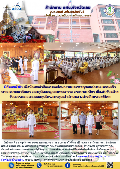 วันอังคาร ที่ ๑๕ พฤศจิกายน ๒๕๖๕ เวลา ๑๔.๐๐ น. นายประกอบ โพธิ์ราม ผู้อำนวยการ สำนักงาน กศน. จังหวัดเลย พร้อมด้วยนางนงลักษณ์ พร้อมจะบก ผู้อำนวยการ กศน.อำเภอเมืองเลย นายกิตติพงษ์ โกษาจันทร์ ผู้อำนวยการ กศน. อำเภอด่านซ้าย และนายสมพร มาตย์สุริย์ ครู กศน.อำเภอเมืองเลย เข้าร่วมพิธีทอดผ้าป่า เพื่อน้อมเกล้าน้อมกระหม่อมถวายพระราชกุศลแด่ พระบาทสมเด็จพระบรมชนกาธิเบศร มหาภูมิพลอดุลยเดชมหาราช บรมนาถบพิตร เนื่องในวันคล้ายวันสวรรคต และสมทบทุนโครงการทุนเล่าเรียนหลวงสำหรับพระสงฆ์ไทย โดยมี นายณรงค์ จีนอ่ำ รองผู้ว่าราชการจังหวัดเลย เป็นประธาน ณ หอฉัน วัดศรีสุทธาวาส พระอารามหลวง อำเภอเมืองเลย จังหวัดเลย