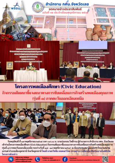 วันพฤหัสบดี ที่ ๑๗ พฤศจิกายน ๒๕๖๕ เวลา ๐๙.๐๐ น. นายประกอบ โพธิ์ราม ผู้อำนวยการ สำนักงาน กศน. จังหวัดเลย เข้าร่วมโครงการพลเมืองศึกษา (Civic Education) กิจกรรมสัมมนาชี้แจงแนวทางการขับเคลื่อนภารกิจสร้างพลเมืองคุณภาพ (รุ่นที่ ๓) ภาคตะวันออกเฉียงเหนือ ระหว่างวันที่ ๑๗ - ๑๘ พฤศจิกายน ๒๕๖๕ ณ ห้องประชุมสยามมนต์ตรา โรงแรมสยามแกรนด์ อำเภอเมืองอุดรธานี จังหวัดอุดรธานี โดยมี นายธวัชชัย เทอดเผ่าไทย กรรมการการเลือกตั้ง เป็นประธานในพิธีเปิดโครงการดังกล่าว